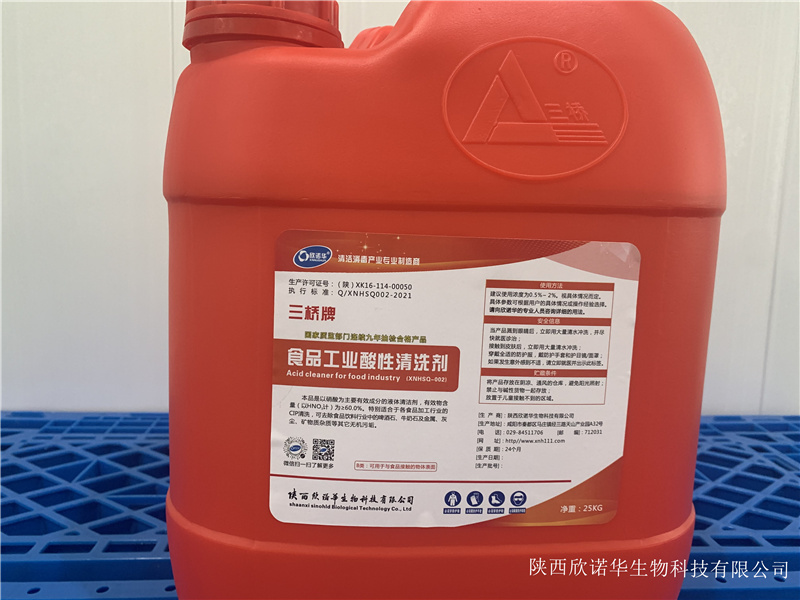 三橋牌食品工業(yè)酸性清洗劑(XNHSQ-2型)是以硝酸為主要有效成分的液體清潔劑,有效成份為35~60%,特別適合用于食品、飲料、乳品、啤酒等行業(yè)設(shè)備,容器、管道的CIP清洗使用。