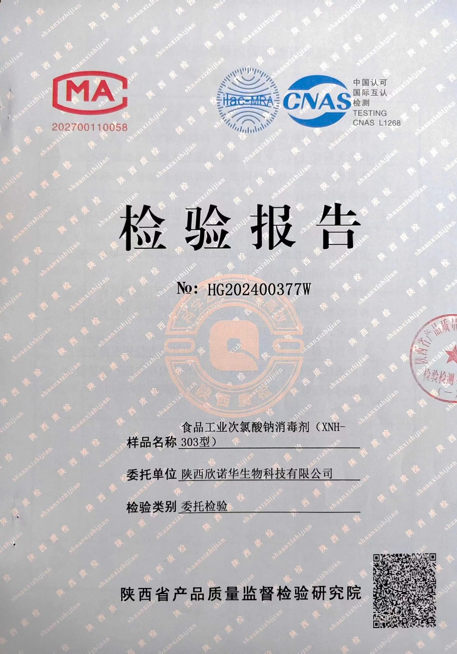 欣諾華牌食品級次氯酸鈉消毒劑檢測報(bào)告(XNH303型)(2024年度)-陜西欣諾華生物科技有限公司