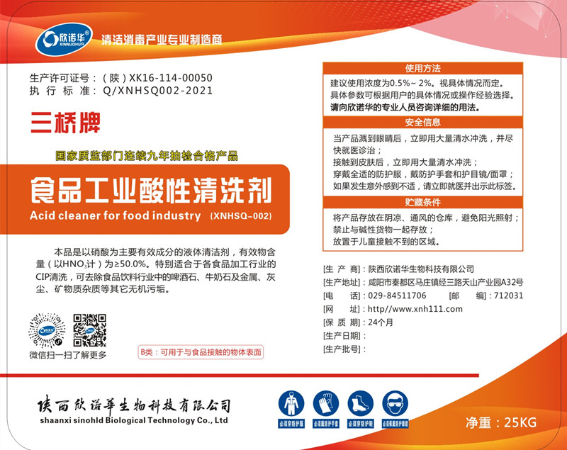 1.三橋牌食品工業(yè)酸性清洗劑(XNHSQ-2型)是一種無色或淡黃色透明、無泡、濃縮的液體高效酸性清洗劑,能強力去除頑固復雜的礦物質(zhì)污垢、乳垢,在堿性清洗完成后,用它作為酸性清洗劑,能有效防止奶石、石灰質(zhì)及其他礦物質(zhì)污垢的積聚。
