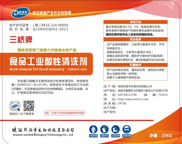 食品設備清洗劑酸性(三橋牌)產品名稱:三橋牌食品工業(yè)酸性清洗劑,含量30%~60%,陜西欣諾華生物科技有限公司生產,產品說明:三橋牌食品工業(yè)酸性清洗劑(XNHSQ-2型)是以硝酸為主要有效成分的液體清潔劑,有效成份為35~60%,特別適合用于食品、飲料、乳品、啤酒等行業(yè)設備,容器、管道的CIP清洗使用