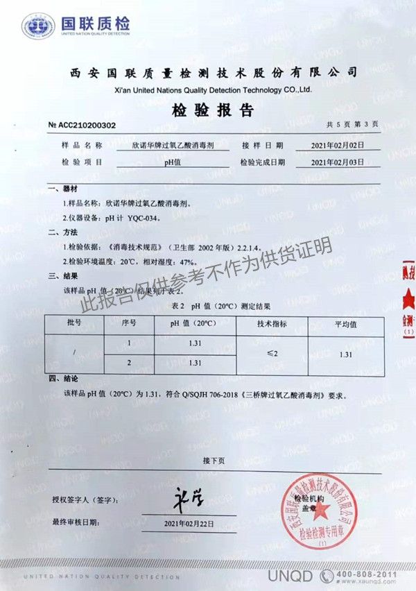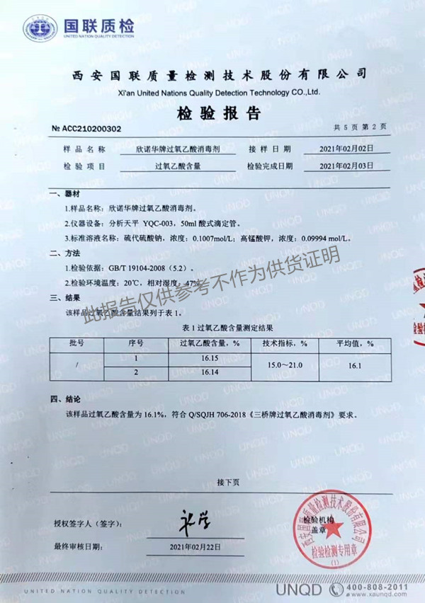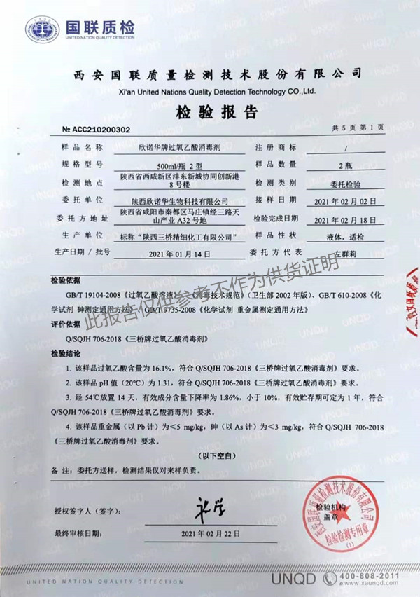 欣諾華牌過(guò)氧乙酸消毒劑(SQ-706型)檢測(cè)報(bào)告(2021年度)-陜西欣諾華生物科技有限公司