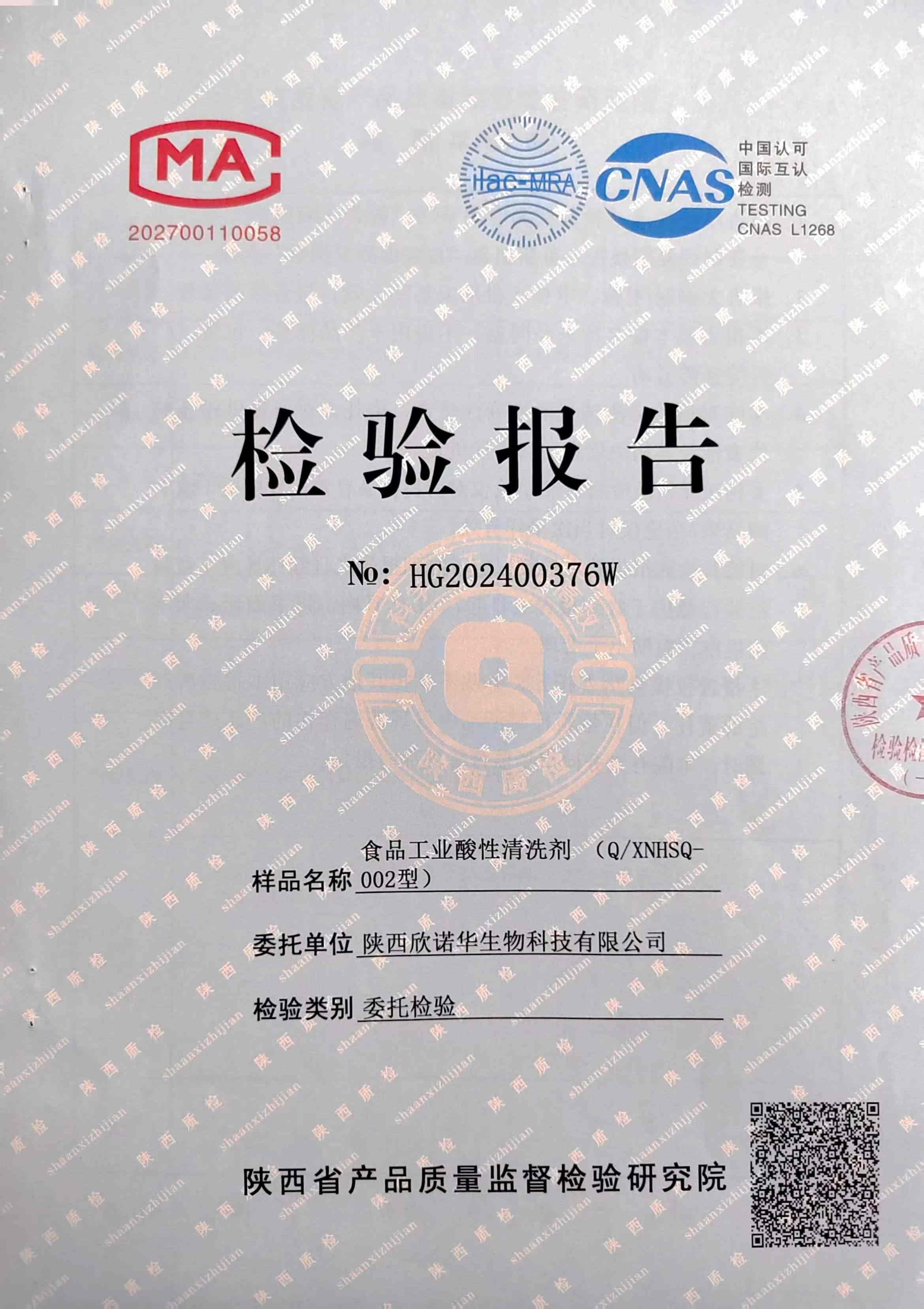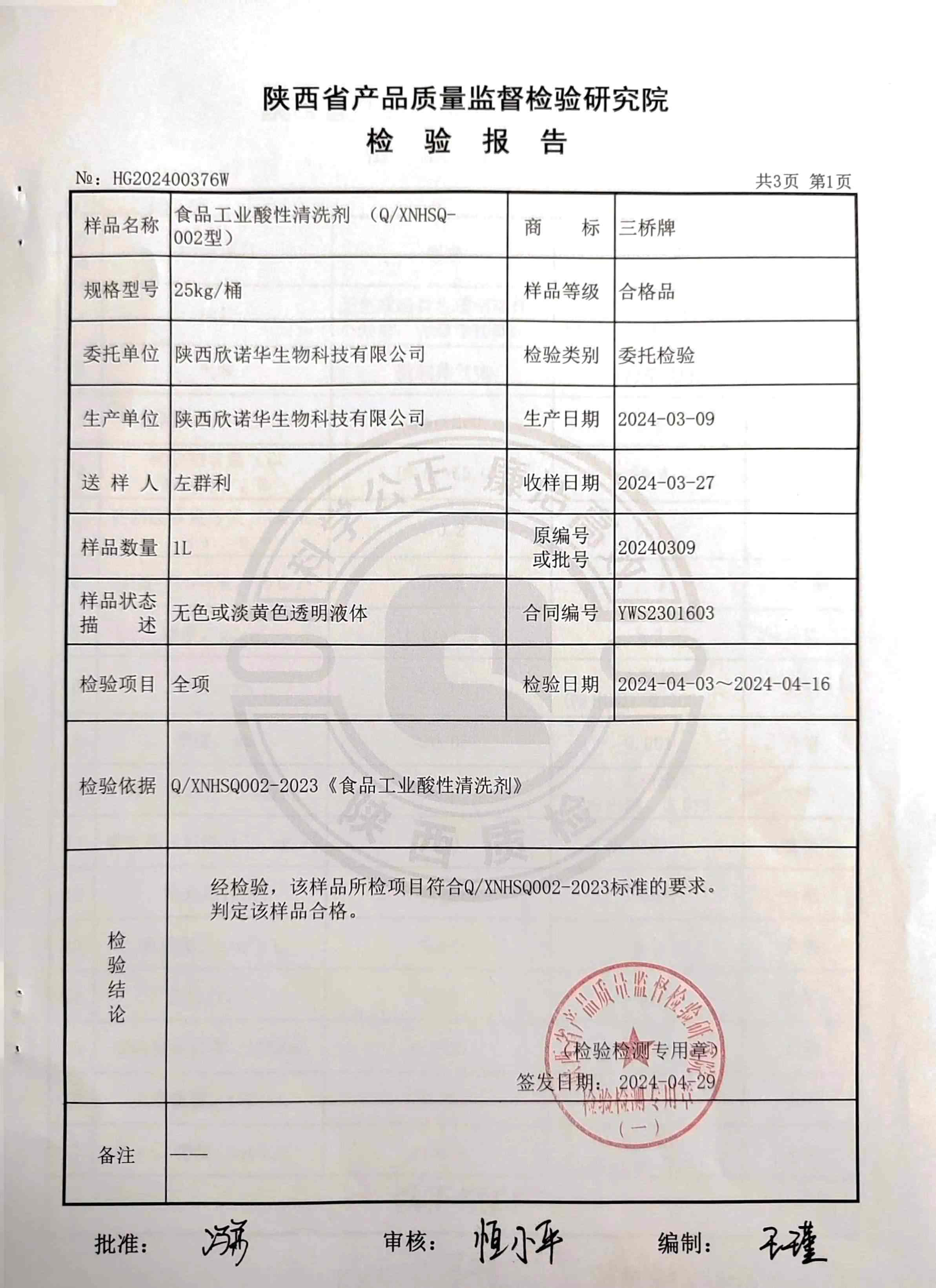 三橋牌食品工業(yè)酸性清洗劑XNHSQ-2檢測報告(2024年度)-陜西欣諾華生物科技有限公司