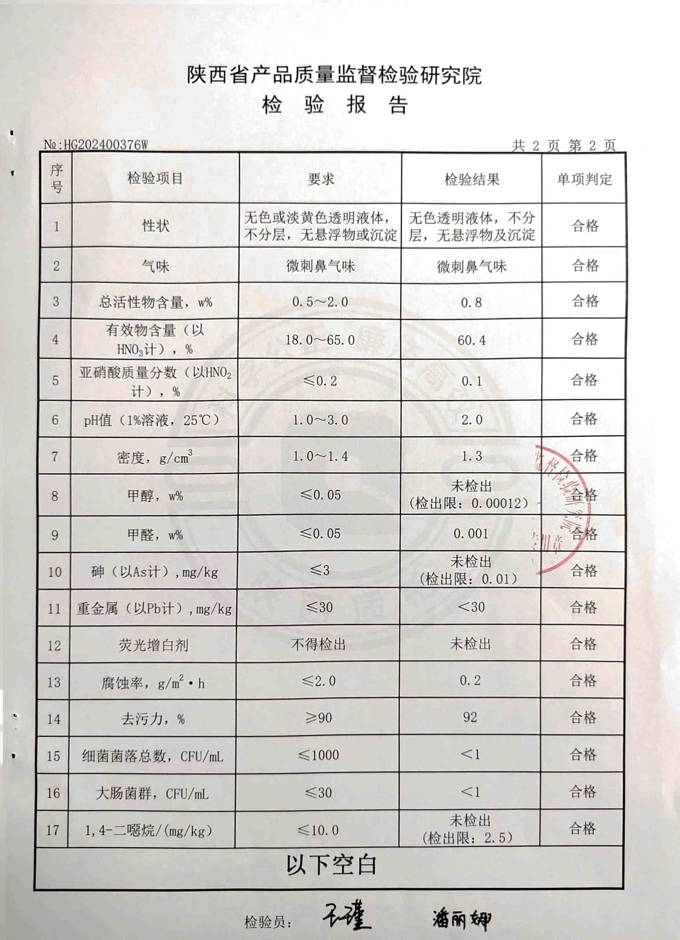 食品工業(yè)酸性清洗劑檢測報告(2024年度)