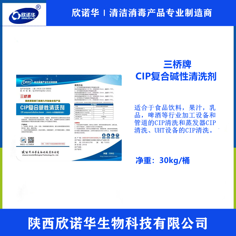 cip堿性清洗劑(商品名:三橋牌cip復(fù)合堿性清洗劑)是陜西欣諾華生物科技有限公司生產(chǎn)的以食品級堿、潤濕劑、滲透劑、緩蝕劑等,適合于食品飲料,果汁,乳品,啤酒等行業(yè)加工設(shè)備和管道的CIP和蒸發(fā)器CIP清洗和UHT設(shè)備的CIP清洗使用。