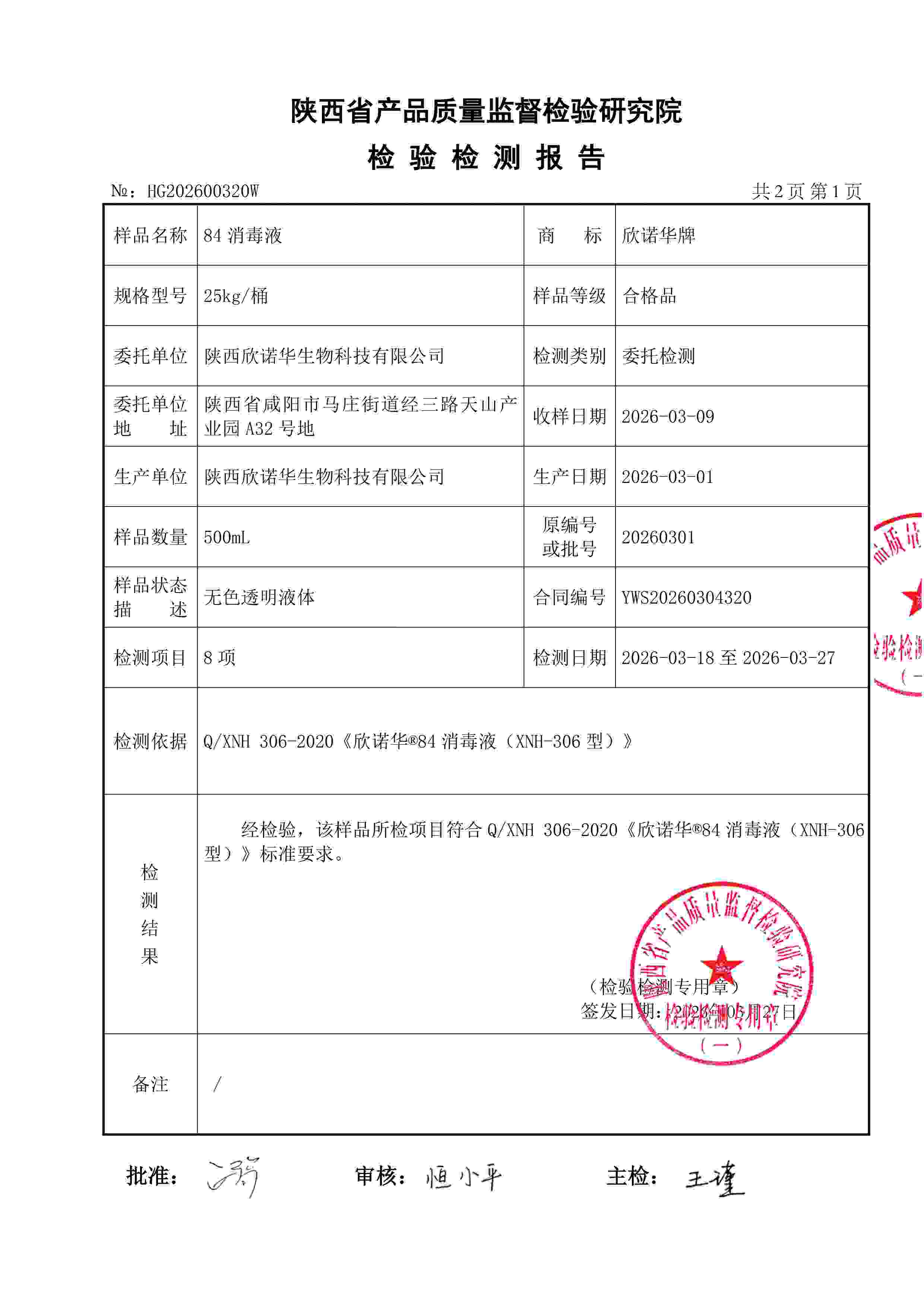 欣諾華牌84消毒液檢測報(bào)告(2026年度)-陜西欣諾華生物科技有限公司